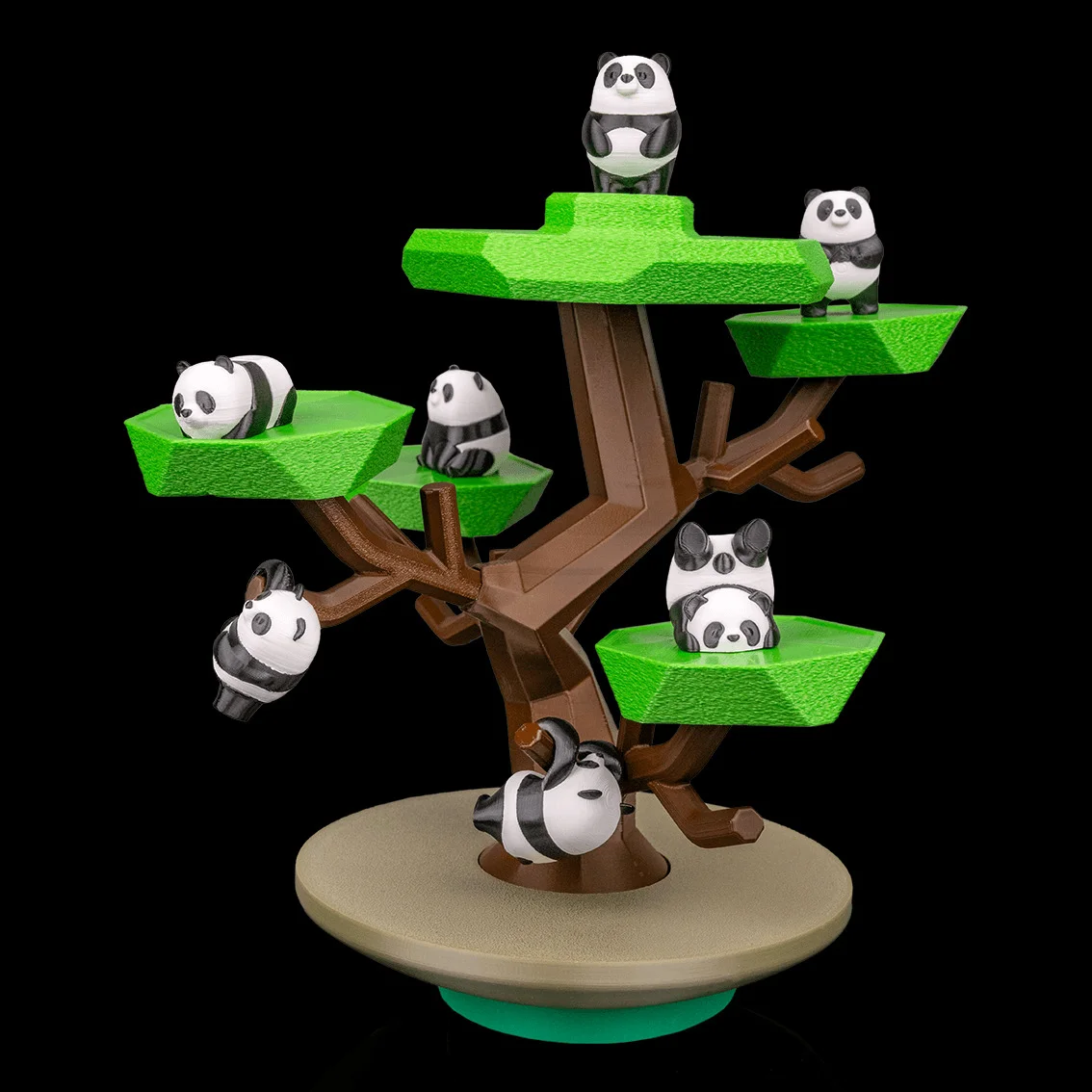 A playful tabletop balance game where players take turns placing pandas on a bonsai tree.